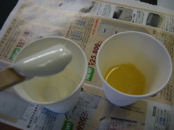 | エポキシ樹脂とパウダーセルを混ぜるとパテになります。硬さは、混ぜる量で調節。 | クロスを使う場合にはパテ状にしたものと樹脂の状態の2つを用意。 | クラッシュ部を60番でサンディング。 | 穴に、まずパテを充てる。 |